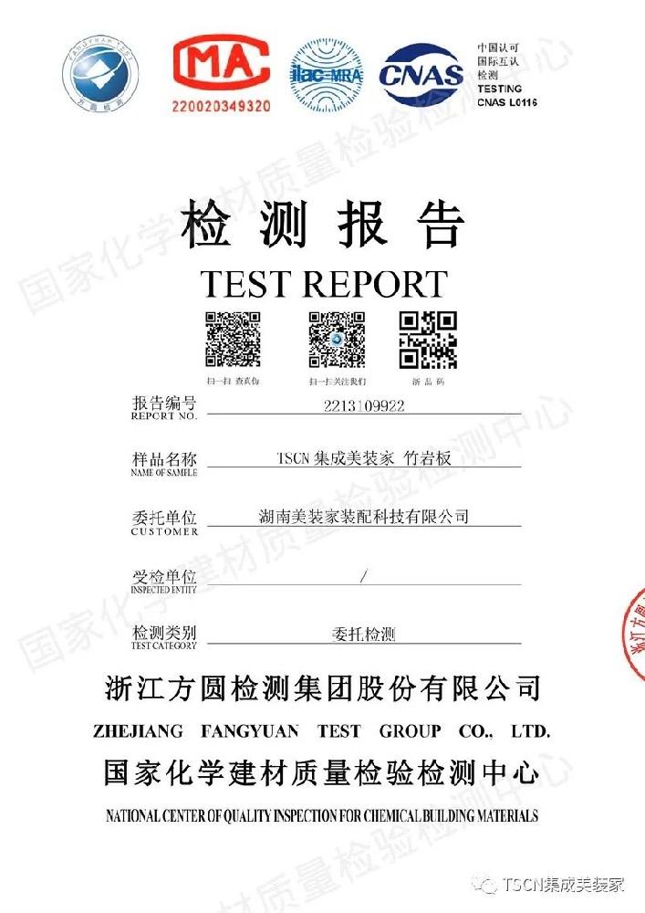 TSCN集成美裝家竹巖板2022年環保檢測報告