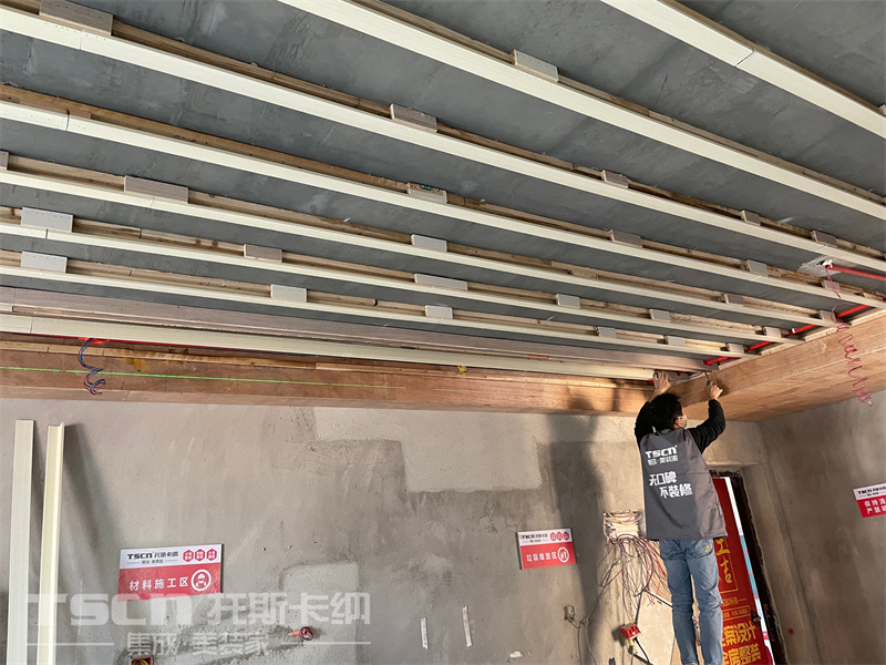 這是一套樣板房施工現場,施工物料的布置、頂面龍骨打底的施工場景嚴格按照公司標準,以確保裝修過程的整潔無錯漏。1、材料標識貼,按標準堆放物料。2.工人按要求穿戴工作服,不抽煙不亂扔垃圾。3.粉塵環境,佩戴口罩,保護健康。4.按標準打龍骨,龍骨之間距20CM。